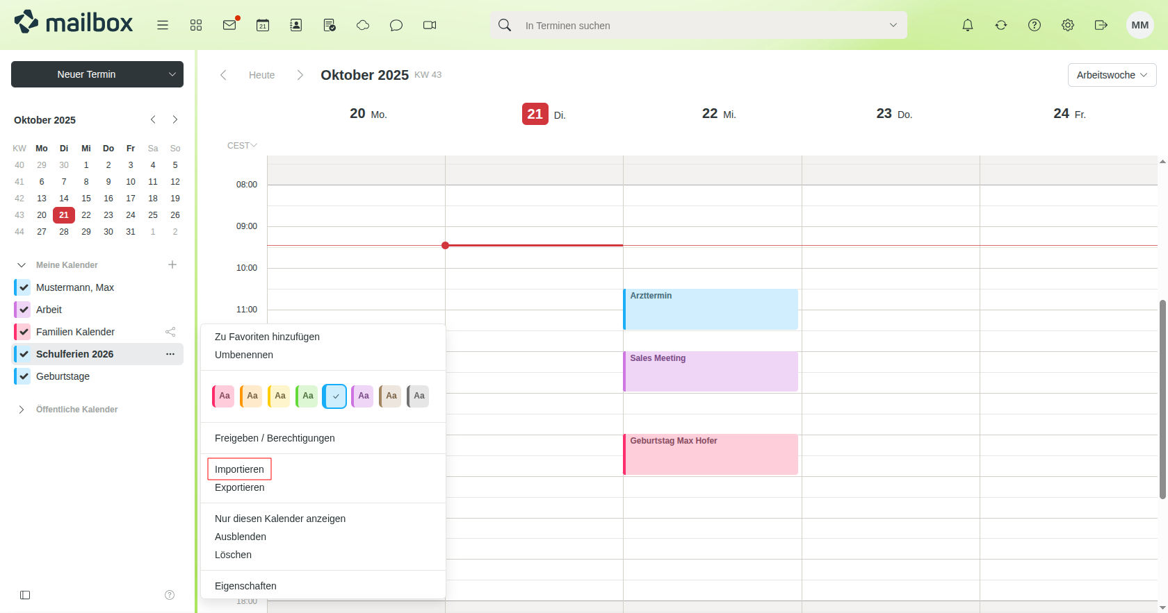Öffnen Sie nun Ihren mailbox-Account und wählen Sie im Reiter Kalender den Kalender aus, in den Sie die iCal-Datei importieren möchten.