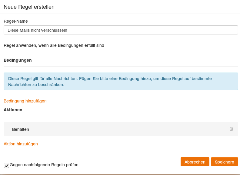 Wenn Sie bestimmte Mails von der Verschlüsselung ausschließen möchten, legen Sie einfach eine neue Filterregel an und definieren Sie Absender, Betreff oder andere Kriterien, über die der Filter die nicht zu verschlüsselnden Mails erkennen kann. Wählen Sie als Aktion behalten aus oder lassen Sie die betroffenen Mails direkt in einen anderen Ordner verschieben.