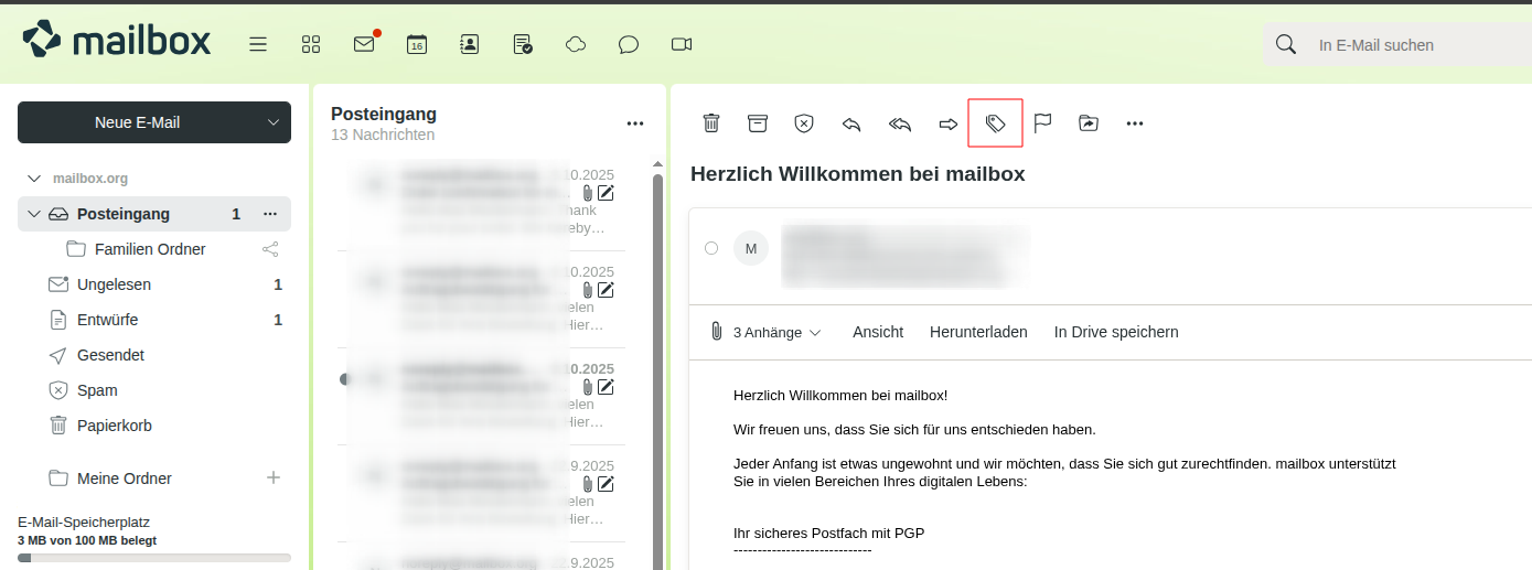 Sie können sich die Mails Ihres Posteingangs nach bestimmten Kategorien sortiert anzeigen lassen. Vielleicht ist Ihnen dieses Feature bereits von Gmail bekannt. Auch bei mailbox stehen Ihnen fünf Filter-Kategorien zur Verfügung Allgemeines, Netzwerke und Einkäufe, deren Bezeichnungen festgelegt sind, sowie Newsletter und Favoriten, deren Namen Sie beliebig anpassen können.