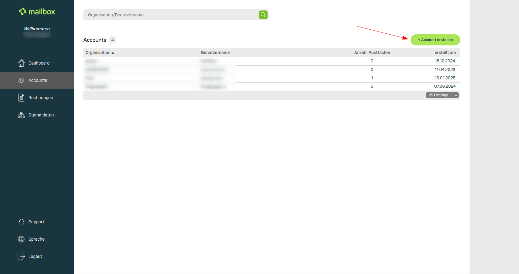 Abbildung 1: Schaltfläche Account erstellen im Dashboard oben rechts, hierüber können neue Kundenkonten angelegt werden.