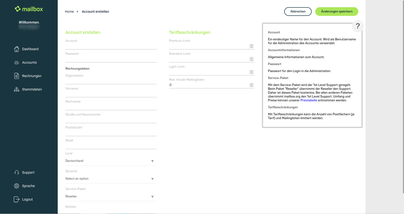 Hier wird festgelegt, wie viele Postfächer der Kunde in den jeweiligen Tarifen (Light, Standard, Premium) anlegen kann. Ebenso wird hier die maximale Anzahl der möglichen Mailinglisten festgesetzt. Um die Einrichtung des Kundenkontos abzuschließen, drücken Sie auf "Änderungen speichern" oben rechts im Dashboard.