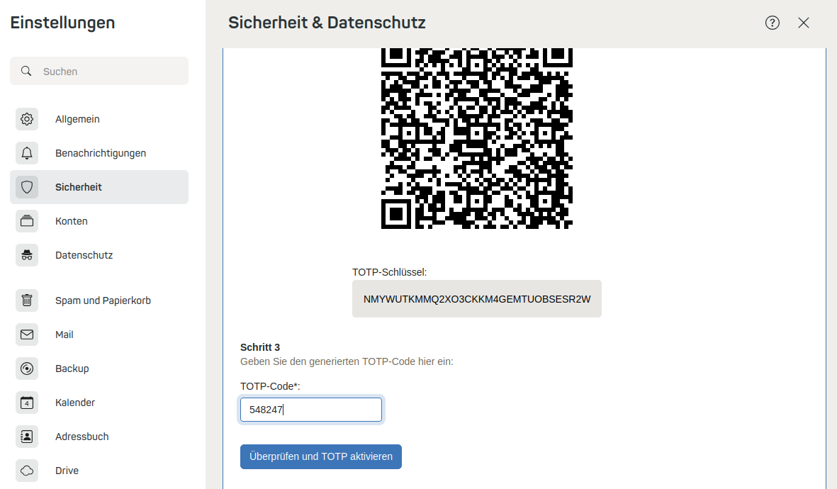 2FA erhöht die Sicherheit Ihrer mailbox erheblich, indem es das Risiko eines unbefugten Zugriffs auf Konten oder Systeme reduziert, selbst wenn ein Passwort kompromittiert wird. Es bietet einen zusätzlichen Schutzfaktor, da Angreifer nicht nur das Passwort, sondern auch den TOTP-Code benötigen würden.
