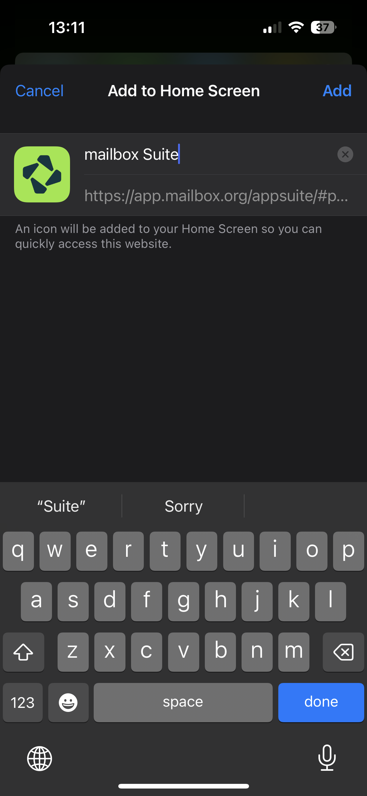 Das Icon für die mailbox Suite wird nun auf Ihrem Home-Bildschirm angezeigt. Wenn Sie das Icon antippen, öffnet sich mailbox direkt als PWA im Vollbildmodus, ohne Browser-Adressleiste.