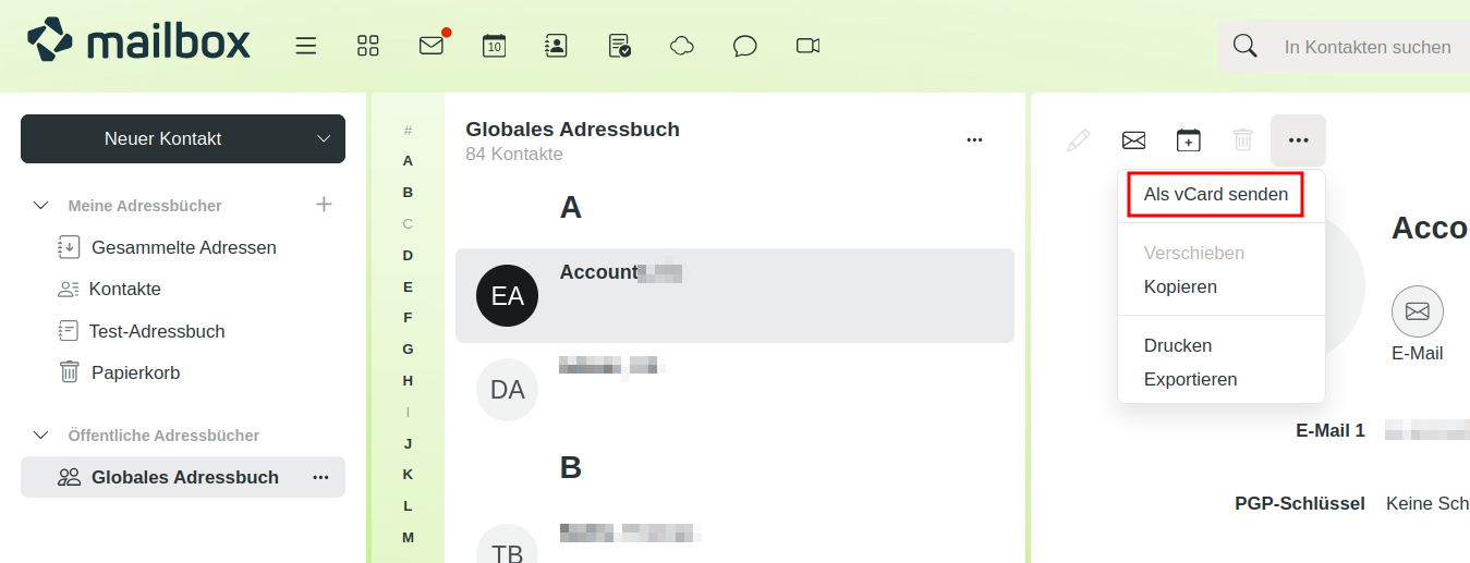 In mailbox können Sie persönliche Kalender und Adressbücher mit anderen Personen teilen – sowohl intern mit anderen mailbox-Nutzern als auch extern. Diese Funktion eignet sich besonders für Familien-Accounts, bei denen mehrere Personen auf denselben Kalender oder dieselbe Kontaktliste zugreifen möchten. Die Freigabe erfolgt über standardisierte Formate wie vCard (für Kontakte) oder iCal (für Kalender), die von vielen Anwendungen unterstützt werden.