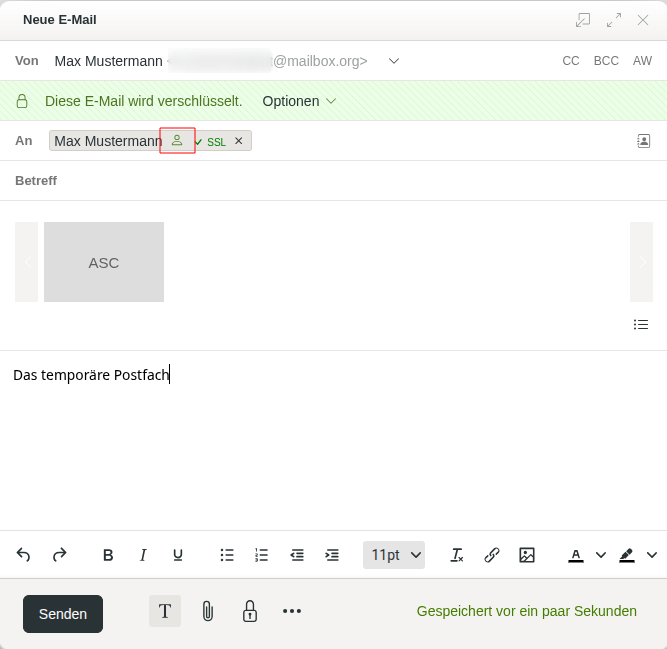 mailbox erstellt für diesen Empfänger automatisch ein temporäres Postfach, sobald Sie diesem Kontakt eine verschlüsselte Mail senden.