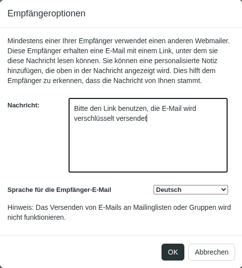 Abbildung 6: Der Empfänger kann nun die verschlüsselte Nachricht einsehen, ohne einen öffentlichen Schlüssel hinterlegt zu haben.