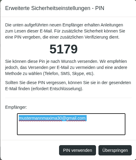 Wenn Sie Ihrem Kontakt die erste verschlüsselte Nachricht schicken, haben Sie zusätzlich die Möglichkeit, Ihre Kommunikation mit einer Zwei-Faktor-Authentifizierung zu schützen, idealerweise mit einer beim Anlegen des temporären Postfachs vergebenen PIN-Nummer. Übermitteln Sie Ihrem Kontakt diese Nummer auf einem dritten, möglichst sicheren Weg (z. B. persönliches Treffen, Anruf, Chat, SMS, Brief, ...). Der Empfänger benötigt den Link aus der Mail und zusätzlich den PIN, um sich einzuloggen (Abbildung 3):