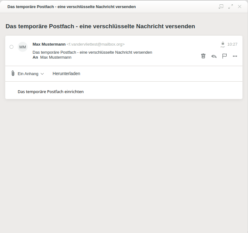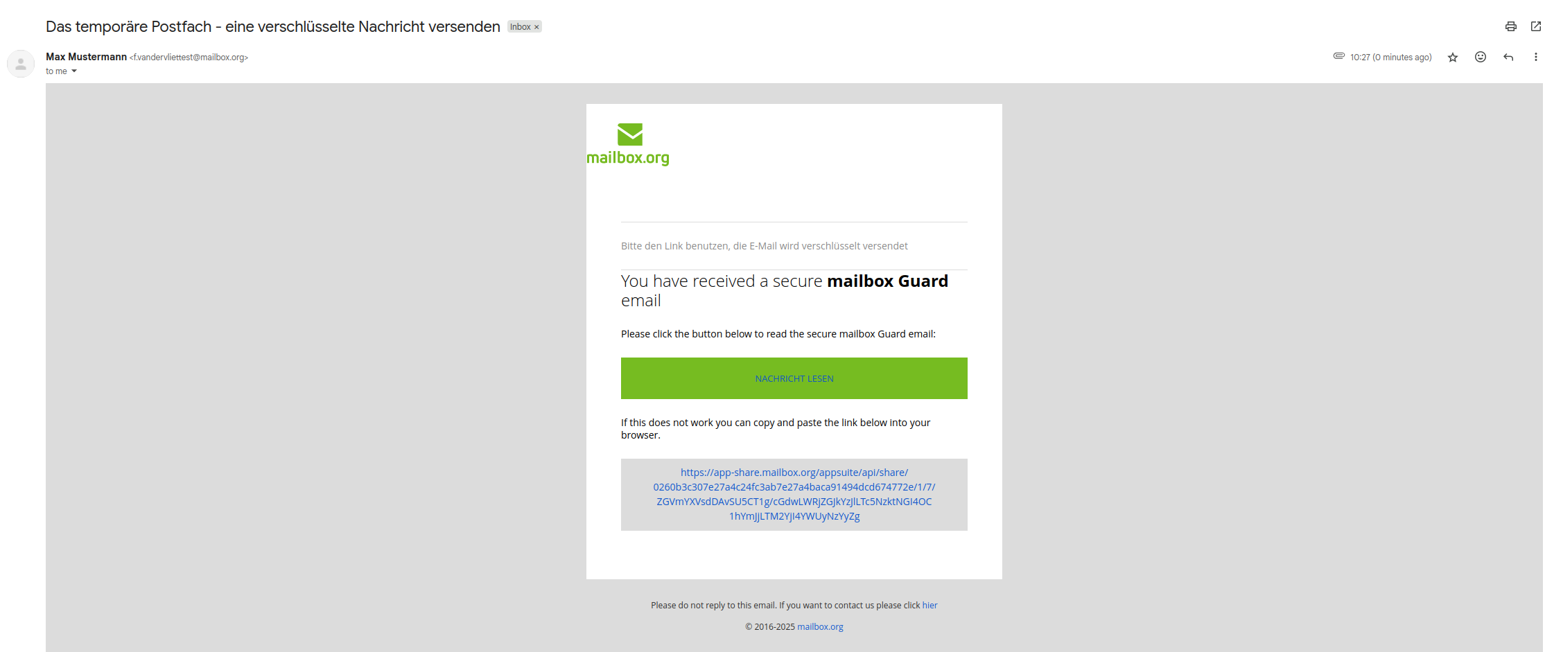 Der Empfänger erhält eine Mail mit dem Link zu einem temporären Postfach: