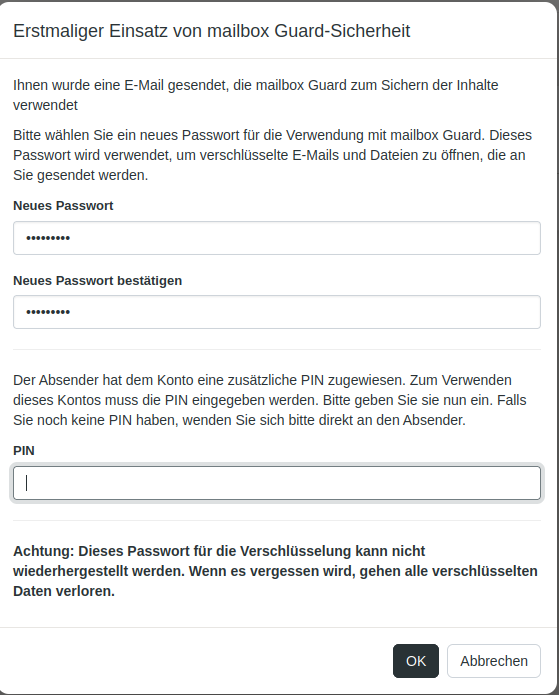 In diesem temporären Postfach, das mit allen unseren Sicherheits-Features versehen ist, kann Ihr Kommunikationspartner die verschlüsselte Mail lesen und beantworten. Auch seine Antworten werden automatisch verschlüsselt. Ist ein temporäres Postfach eingerichtet, so werden alle verschlüsselten Mails, die von einer mailbox-Adresse an die betreffende Adresse geschickt werden, an das temporäre Postfach zugestellt. Die vom temporären Postfach aus versendeten Mails werden im Ordner „Gesendet“ gespeichert. Sobald der Adressat den Link öffnet (und sich mit PIN verifiziert), muss er ein (später nicht mehr änderbares) Passwort für sein temporäres Postfach erstellen. Dieses Passwort kann nicht mehr geändert werden, weil wir nur so sicherstellen können, dass kein Angreifer einen etwaigen Reset-Mechanismus missbrauchen könnte. Temporäre Postfächer werden nach 90 Tagen Inaktivität gelöscht.