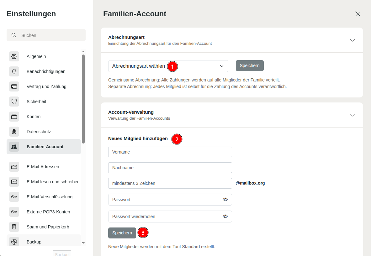 Sie werden nun aufgefordert, die Benutzerdaten des neuen Familienmitgliedes einzugeben. Wählen Sie eine mailbox-E-Mail-Adresse aus, unter der das neue Familienmitglied erreichbar sein soll. Jetzt wäre ein guter Zeitpunkt, sich auch mit der in Abbildung 1 verlinkten Übersicht zu Familien Accounts auseinanderzusetzen.