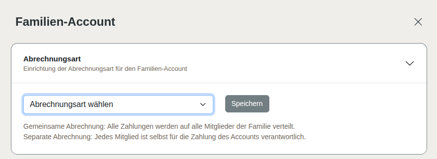 Wenn Sie hier Separate Abrechnung wählen, haben Sie keine Möglichkeit, anzeigen zu lassen, wer in Ihrem Familien Account Mitglied ist. Jedes Mitglied kann weitere Mitglieder anlegen und verwaltet sein eigenes Guthaben.