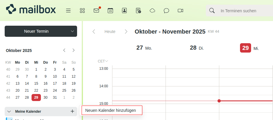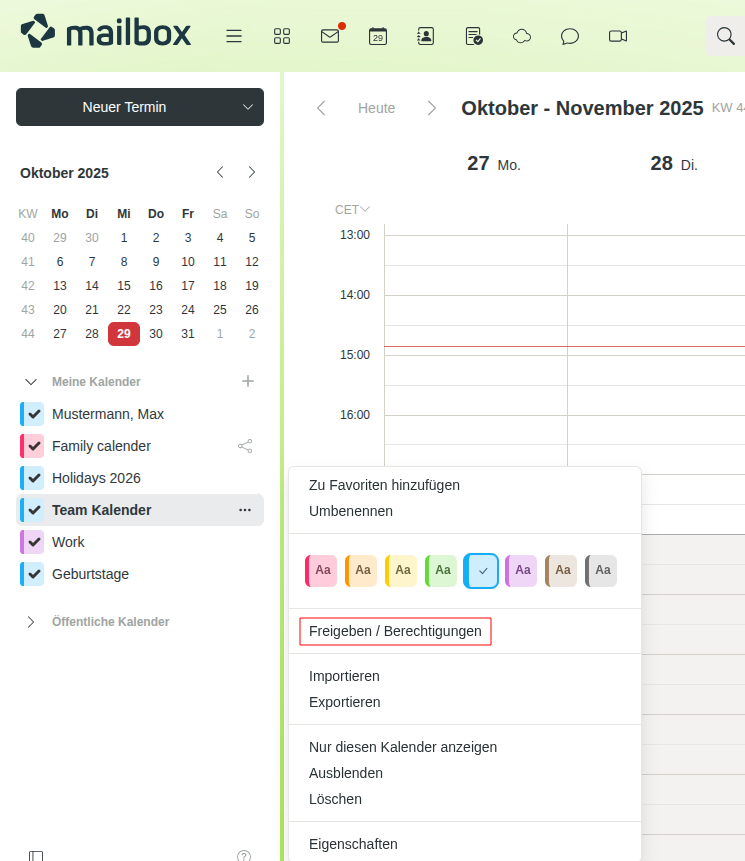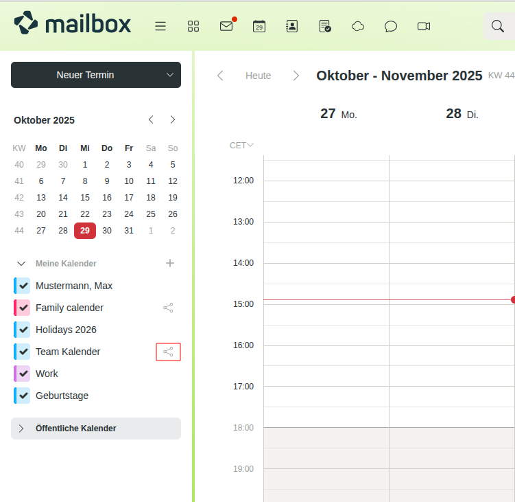 Alle Mitglieder der Gruppe, die Zugriff auf den geteilten Kalender erhalten haben, finden diesen im mailbox Office, im Reiter Kalender unter Freigegebene Kalender.