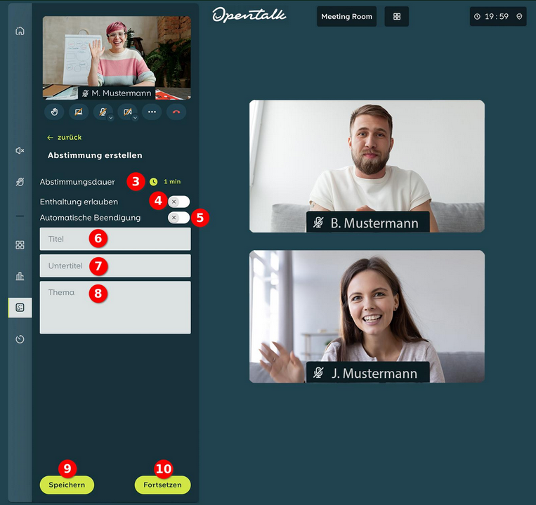 Im folgenden Fenster können Sie die Rahmenbedingungen für Ihre Abstimmung festlegen. Veränderbare Parameter sind dabei die Dauer der Abstimmung (3), die Möglichkeit Enthaltungen zu erlauben (4) sowie eine automatische Beendigung (5) nach Abgabe aller Stimmen. Hier vergeben Sie außerdem den Titel der Abstimmung (6) sowie einen Untertitel (7) und können im Textfeld Thema (8) weitere Details hinterlegen. Sie können die Abstimmung entweder für den späteren Gebrauch Speichern (9) oder die Einrichtung Fortsetzen (10) (Abbildung 2).