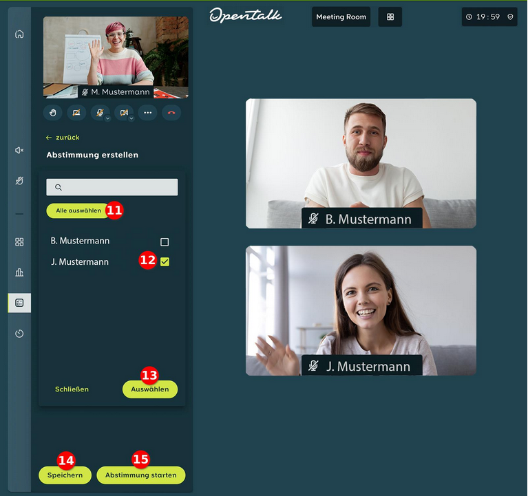 Wenn Sie die Einrichtung fortsetzen, können Sie im nächsten Menü die Teilnehmer für die Abstimmung auswählen. Hier können Sie mit einem Klick einfach Alle auswählen (11) oder bestimmte Personen markieren (12). Mit Auswählen (13) bestätigen Sie Ihre Entscheidung und können auch hier optional Speichern (14) und die Abstimmung zu einem späteren Zeitpunkt aufrufen oder die Abstimmung starten (15) (Abbildung 3).
