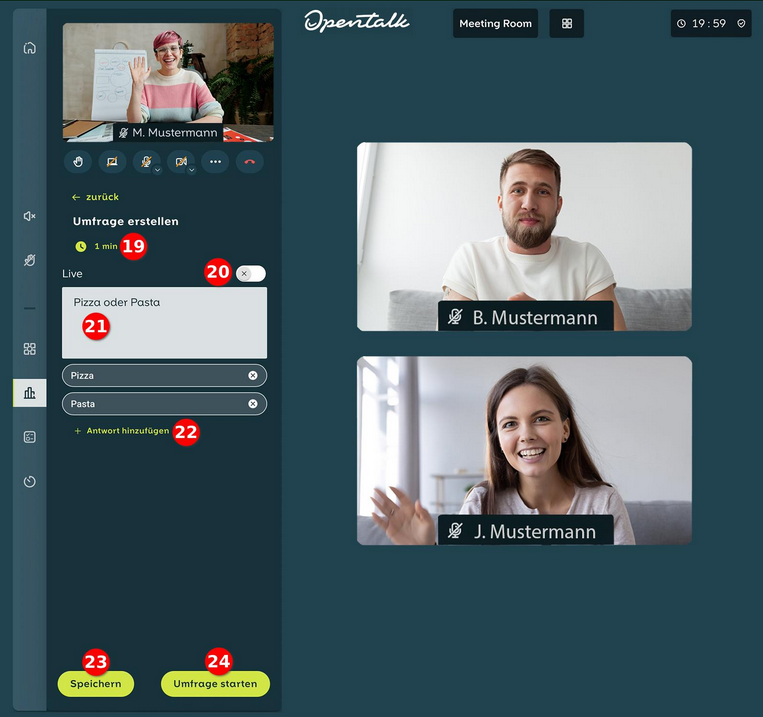 Sie können die Umfrage entweder für einen späteren Zeitpunkt Speichern (22) oder mit Umfrage starten (23) sofort beginnen (Abbildung 5).