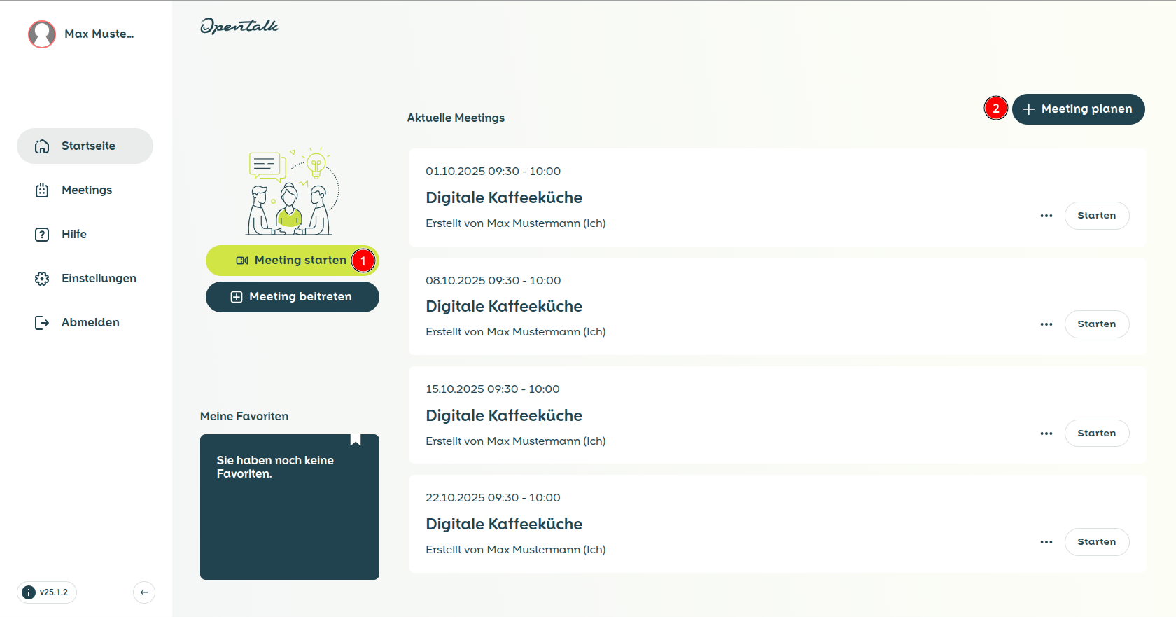 Abbildung 1: Auf der Startseite von mailbox Meet können Sie Meetings direkt starten oder planen.