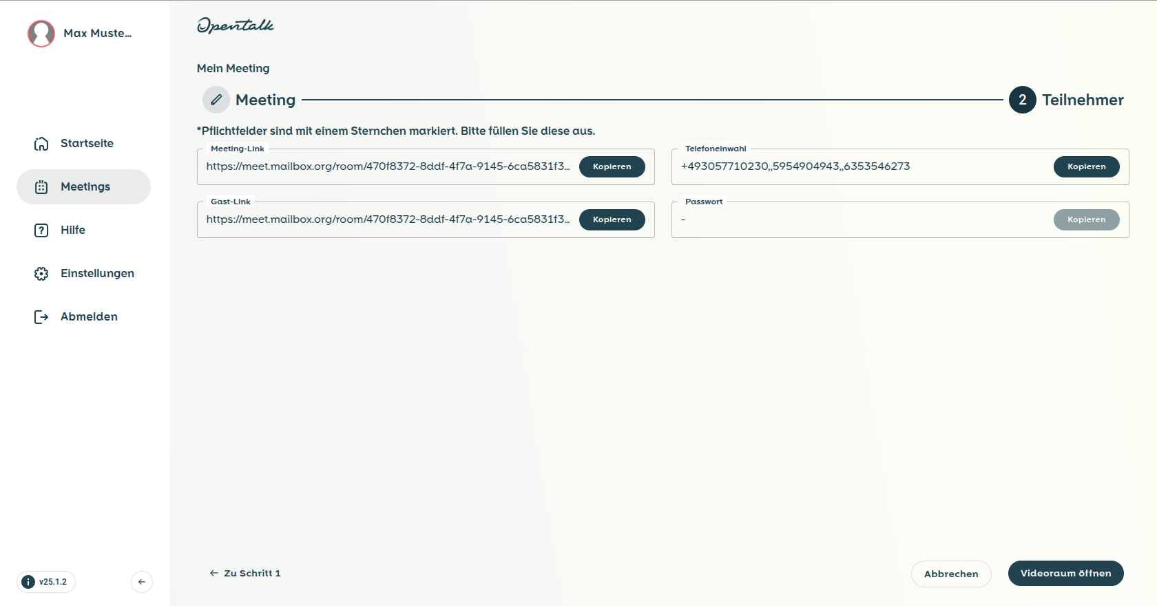 - Der Meeting-Link ist der direkte Zugang für Sie als Administrator.
