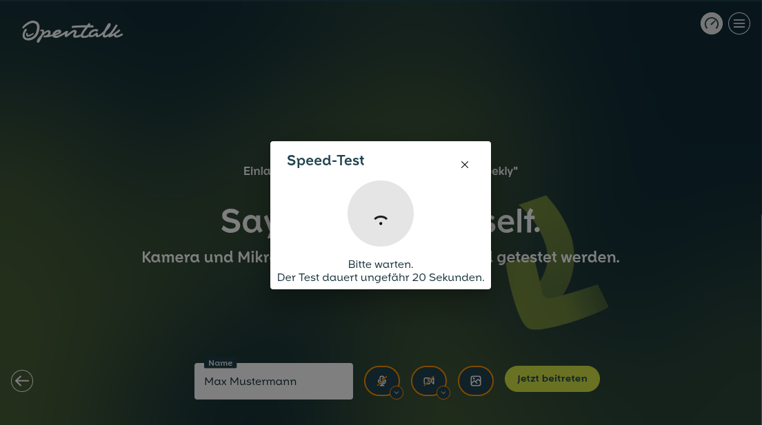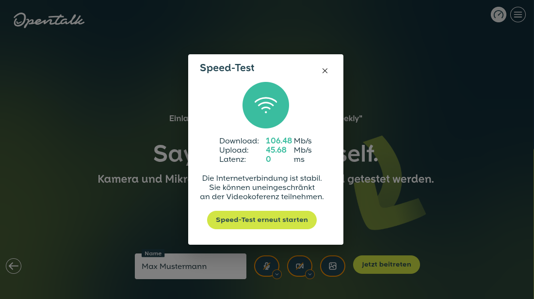 Im Begrüßungsbildschirm können Sie optional einen Speed-Test starten, um die Geschwindigkeit und Stabilität Ihrer Internetverbindung vor dem Meeting zu prüfen.