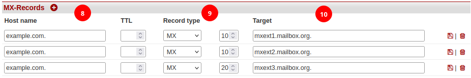 Here, enter the hostname under Hostname, the priority of the respective entry under Priority, and the MX servers from mailbox.org under Target.
