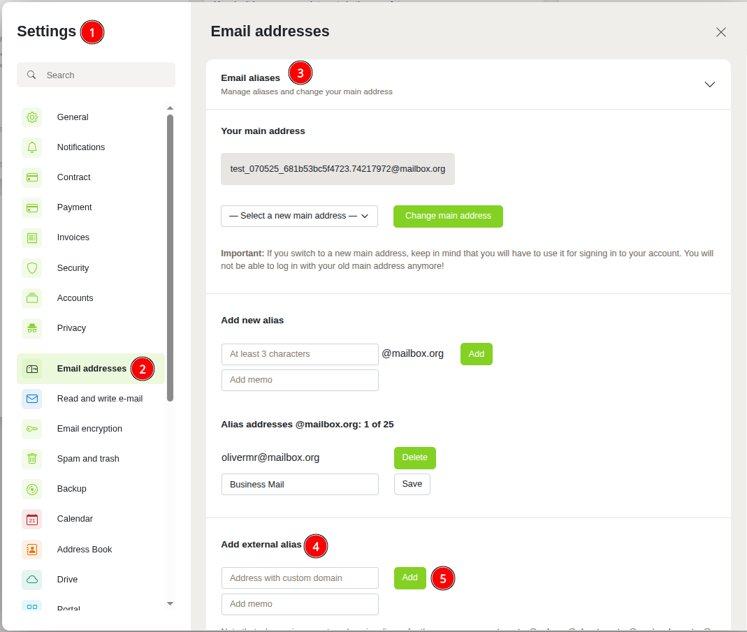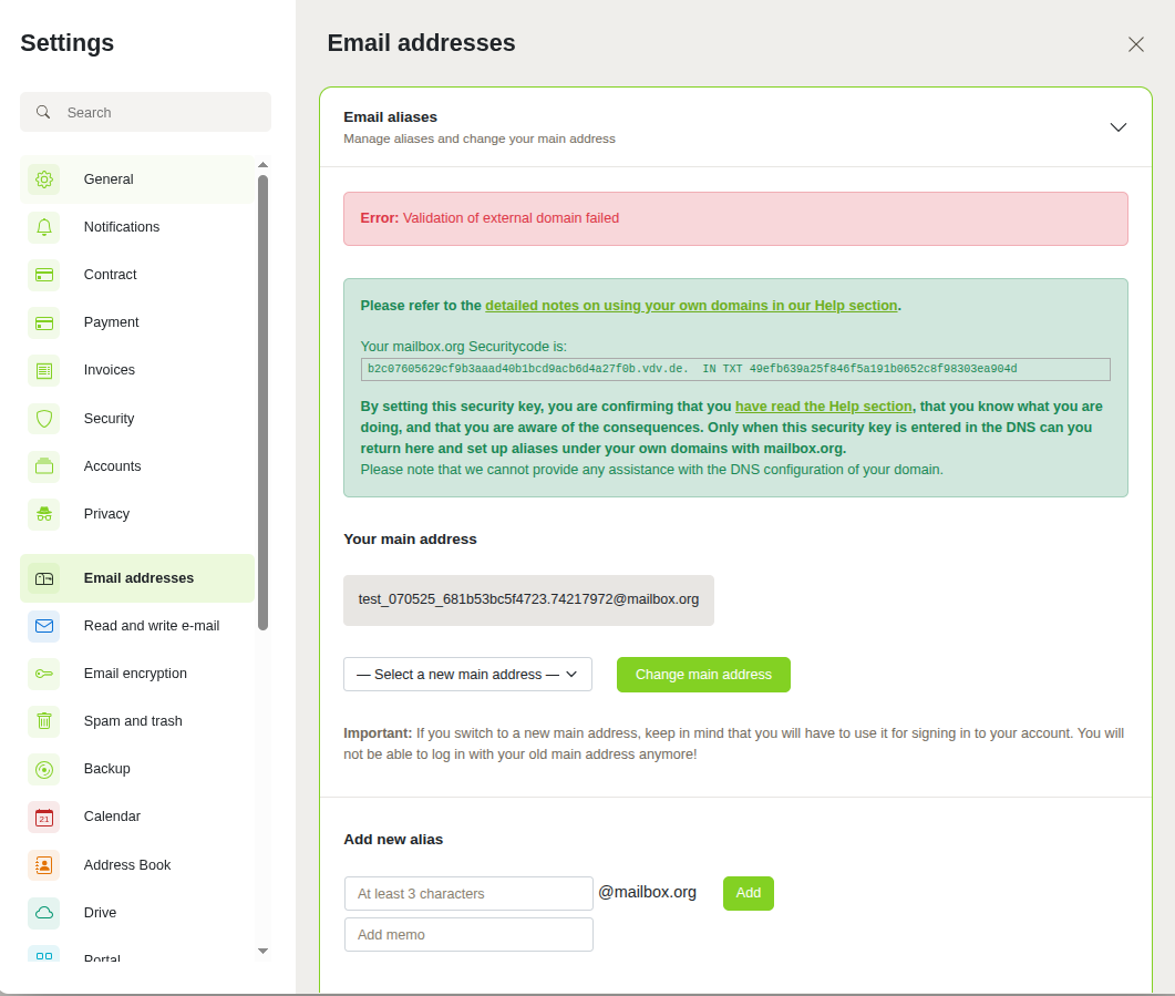 This feature is available in the Premium and Standard plans, as well as in the Light plan when using a Family Account. After successful configuration, you can also define such an alias as your primary address.