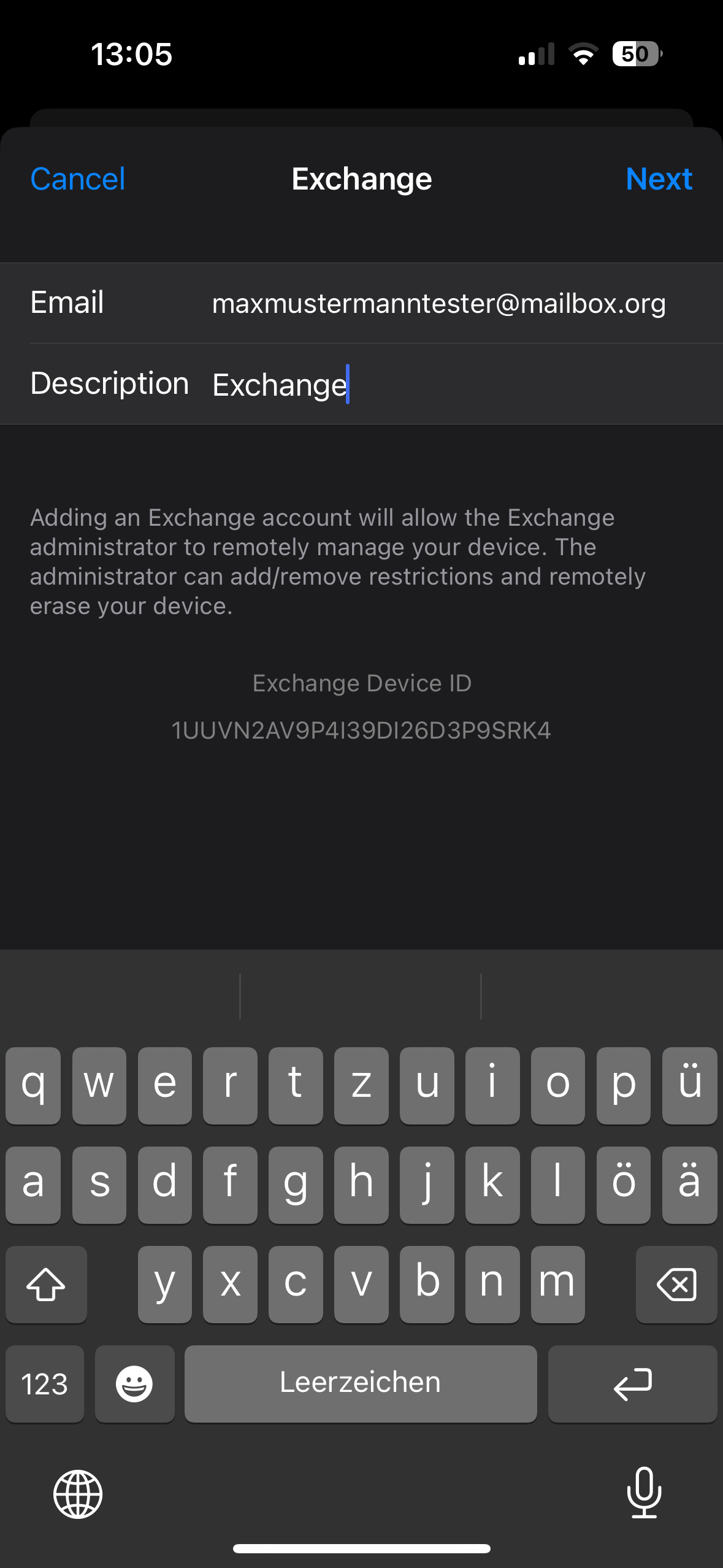 After selecting your synchronization preferences, your mailbox account will be configured via ActiveSync on your device.