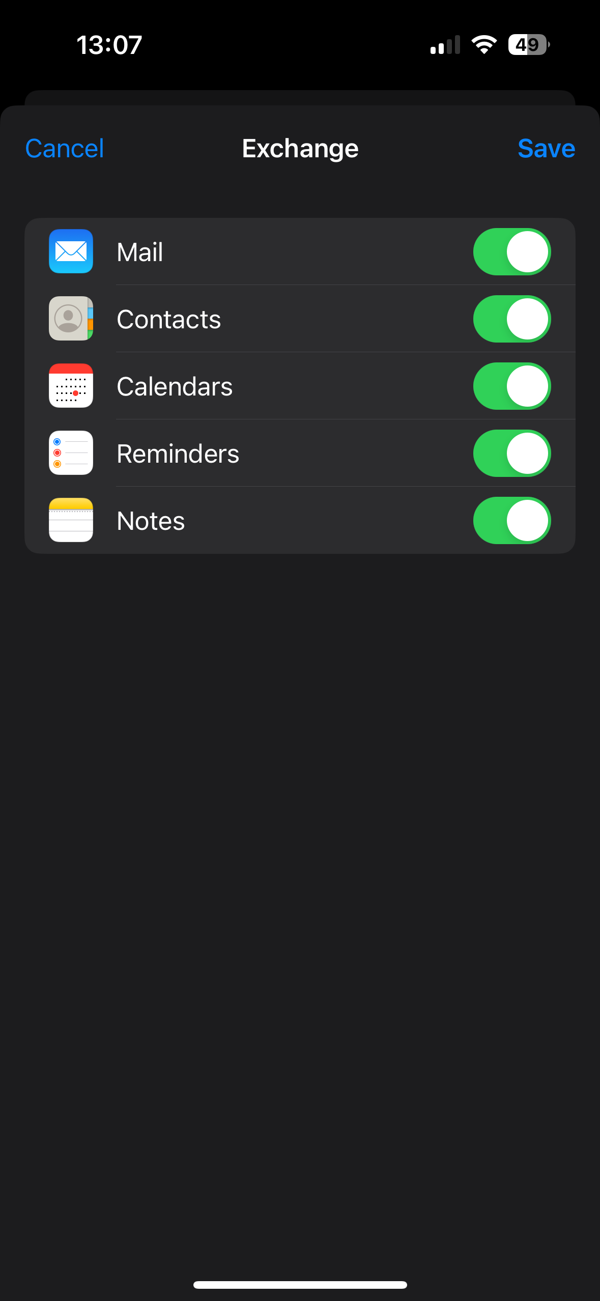 - Choose which data to synchronize (e.g., Mail, Contacts, Calendar).