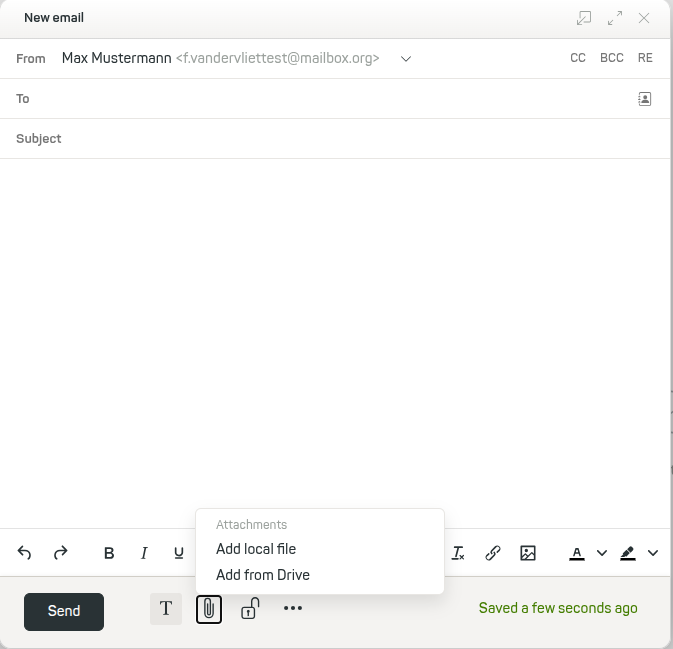 Figure 1: Use the paperclip symbol in the toolbar below to link files from Drive when composing a mail.