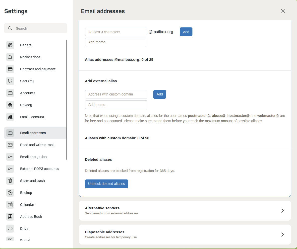 If you have deleted an alias in your account, you can reactivate it at any time within the retention period. Only after this period has expired can the alias be registered by other users. mailbox blocks deleted aliases depending on the age of the account for at least 90 days and thus actively protects your privacy.