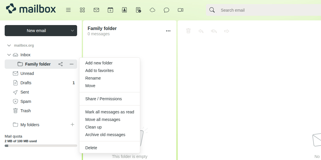 To read and reply to mails together within a Family Account, you do not need to forward mails to all members. Instead, you can simply create a new mail folder and share it by adding other users. In Figure 1, the user has created the folder Family Mail in their inbox in mailbox Office, under the Mail tab.