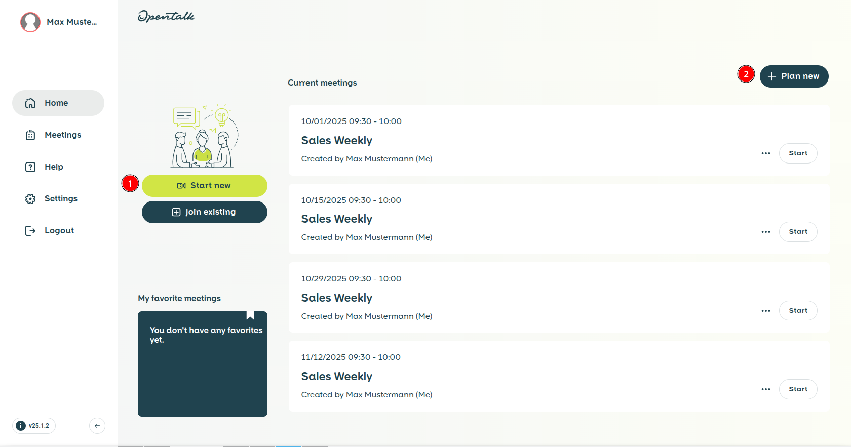 Figure 1: On the start page of mailbox Meet, you can either start a meeting immediately or schedule one.
