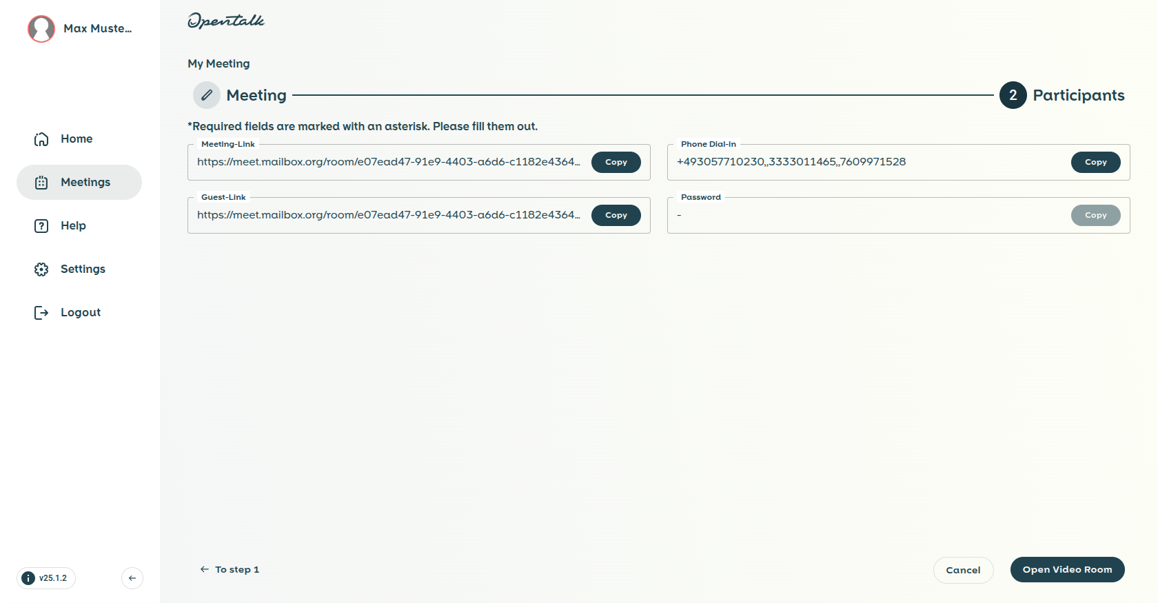 - Once you have completed your preparations, you can proceed by selecting Open video room. You will then be redirected to the welcome screen. For more information, see Getting started with mailbox Meet.