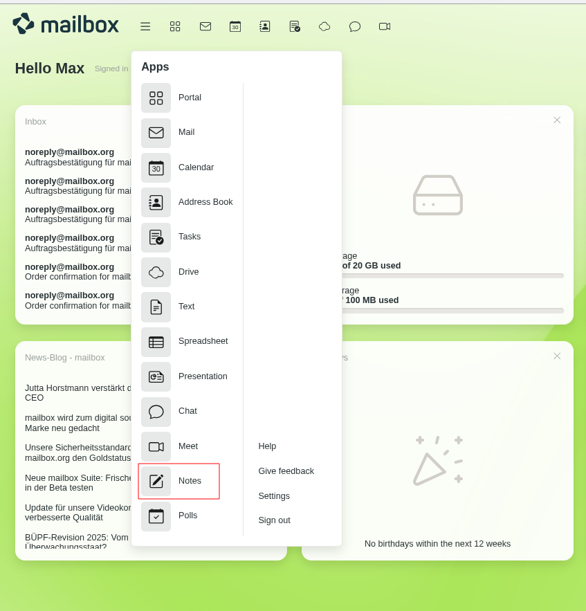 Figure 2: Start Notes via the main menu in your mailbox account, create a new document, or edit existing pads.