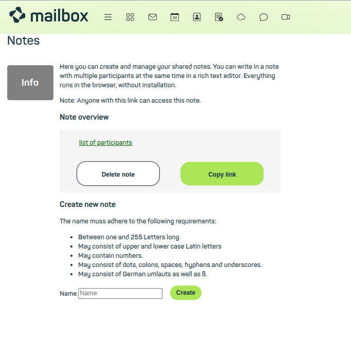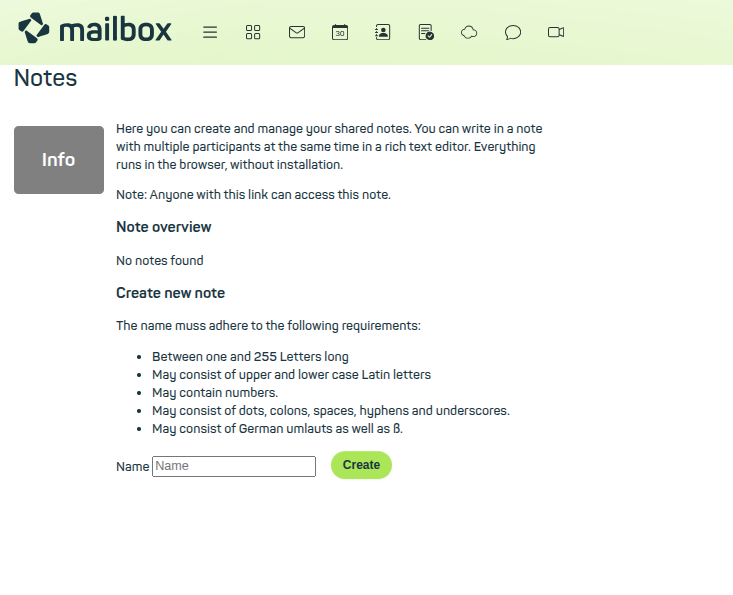 Figure 1: Start Notes via the main menu in your mailbox account, create a new document, or edit existing pads.