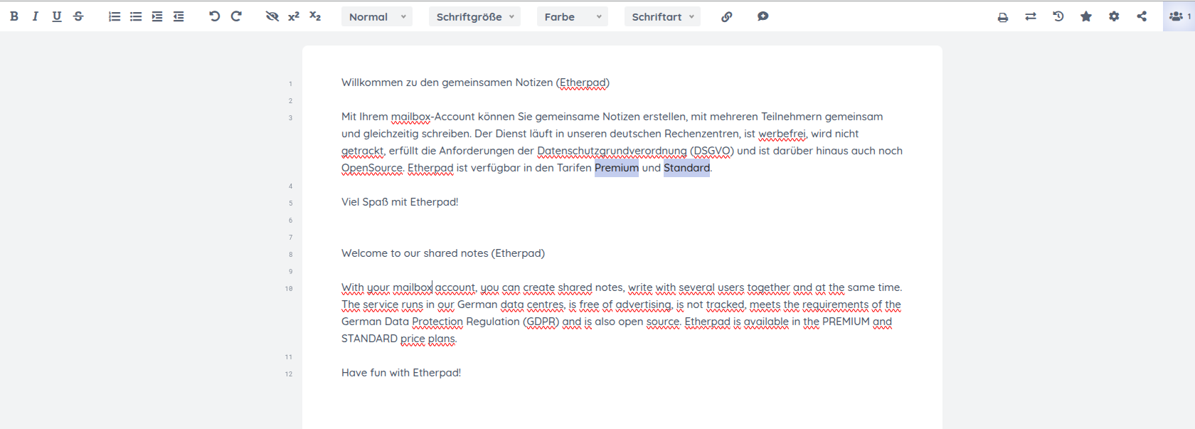 First, log in to your mailbox account. Open the All applications overview via the menu with the three lines next to the mailbox logo and select Notes. You can then either create a new document by assigning a Pad name, or open an existing pad using the corresponding Open link. Share this link at any time with the people who should collaborate with you on the document (Figure 1).