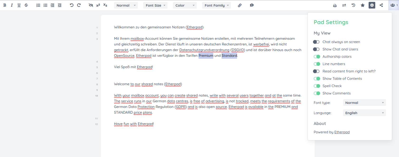 Figure 5: The pad settings provide additional options for collaborative editing and communication.
