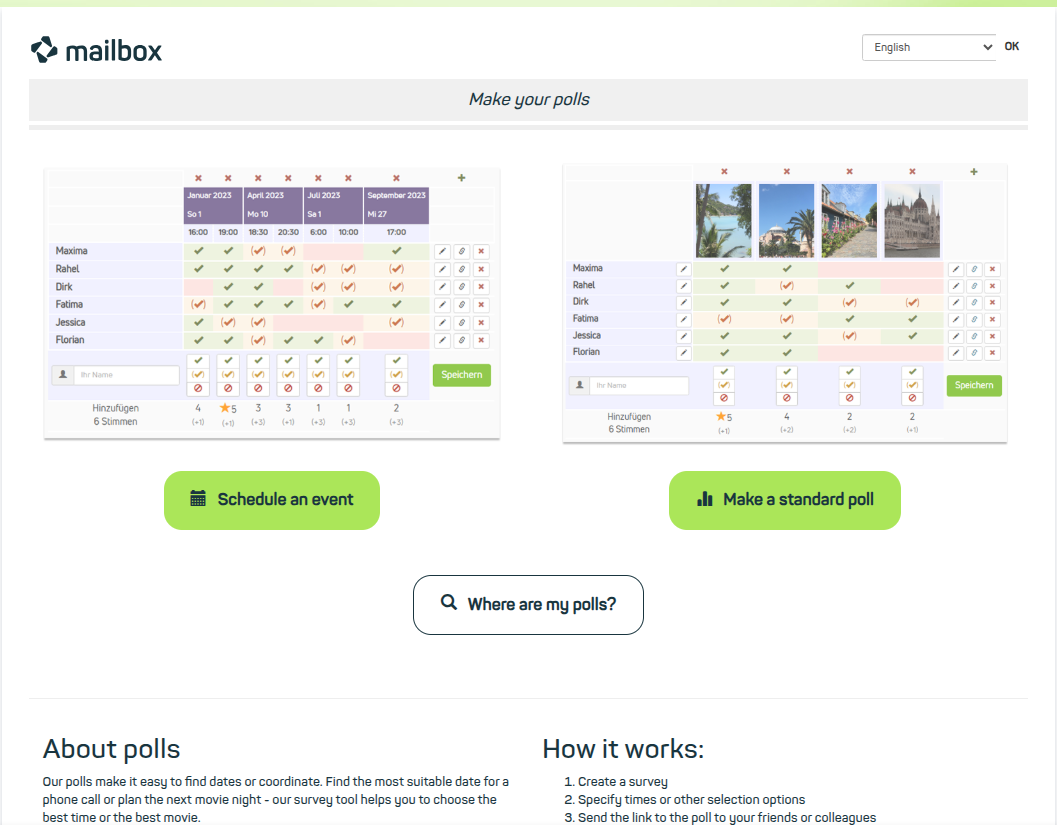 The results of the survey are displayed either directly in the participation area or below in a chart as a diagram. The best option is finally summarized in a text field, showing the date and the number of votes cast. As the administrator of the survey, you will – depending on your configuration – also receive a mail notification for each successful participation (Figure 6).