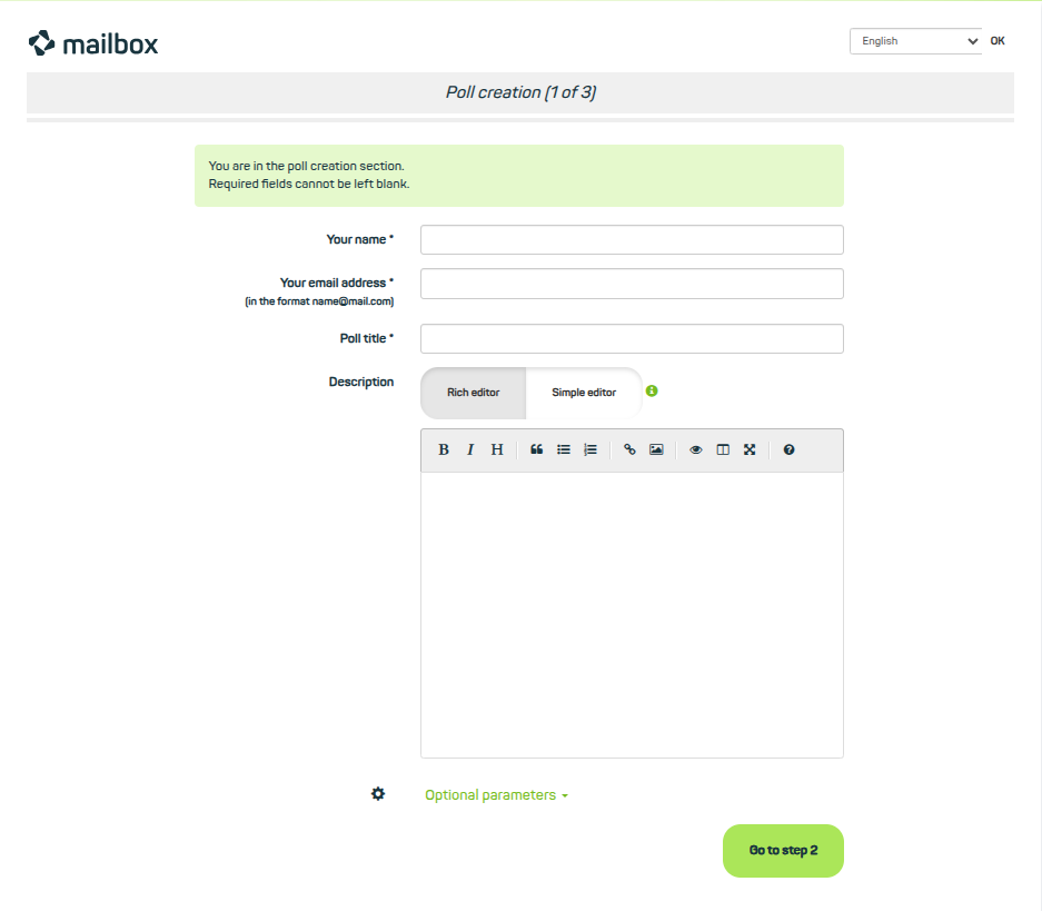 In the first step, enter your name, your mail address, the title of the survey, and optionally a description.
