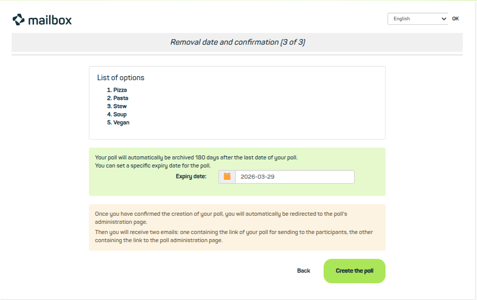 In the final configuration step, you will see a list of the options and can set the voting period – and thus define the archive date. Afterwards you can create the survey (Figure 4).