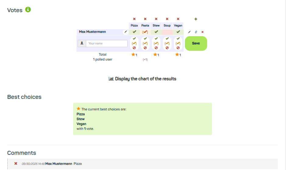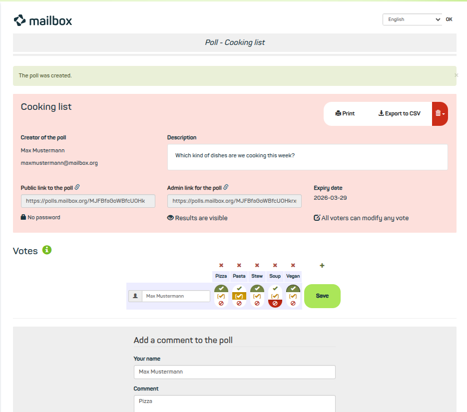 On the administration page you also have the option to export the survey results as a print version or a CSV file. You can also delete the survey if needed. Of course, you can also cast your own vote, participate in the poll, or leave a comment here (Figure 5).