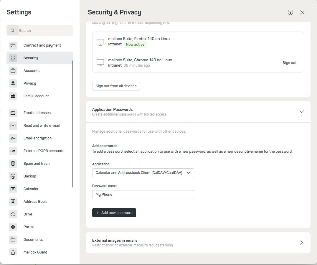 Application Passwords are required for all external applications that cannot handle Login 2.0 or Two-Factor Authentication – for example, classic mail clients or synchronization apps for calendars and contacts. They allow specifically secured access to services such as IMAP, SMTP, CalDAV, CardDAV, or WebDAV, without the need to use the main password.