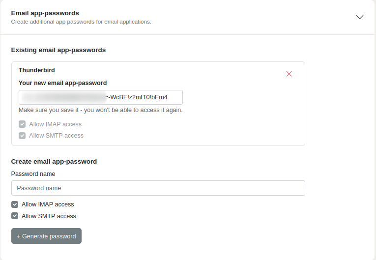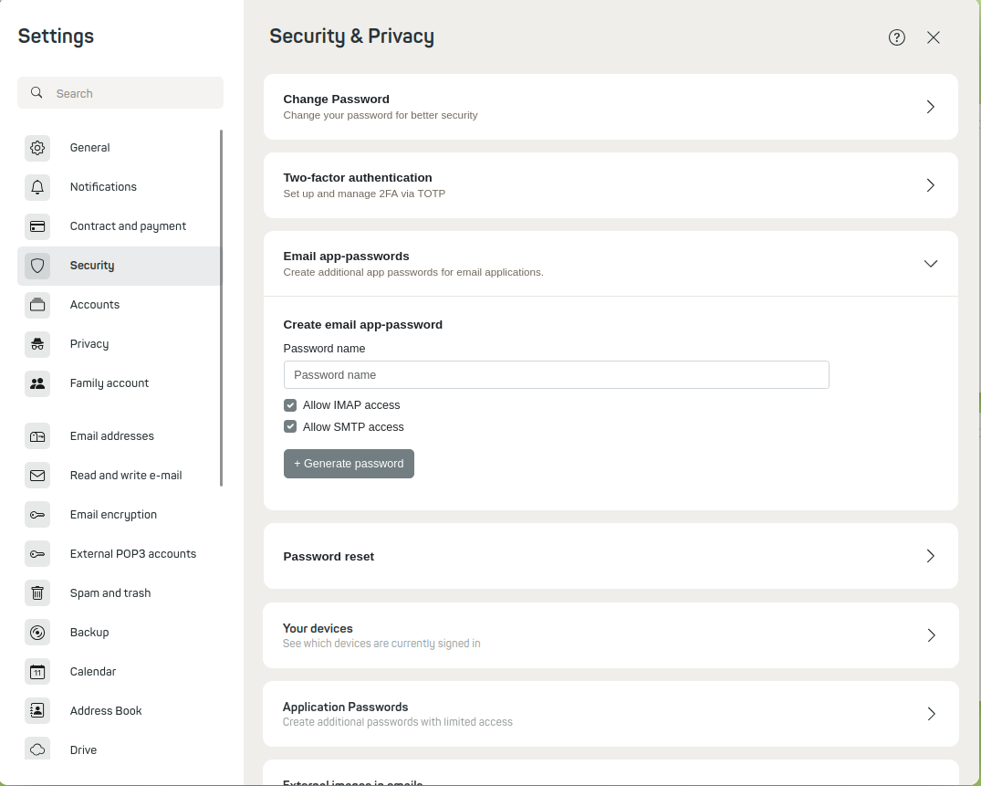 To protect a mail client with a dedicated password or to ensure access when two-factor authentication is enabled, you can create any number of mail app passwords. Simply follow these steps: