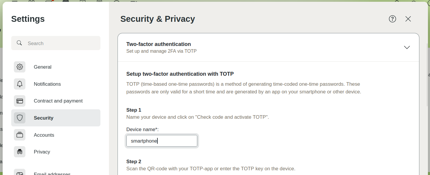 TOTP-based two-factor authentication offers a simple way to secure your account with a second factor – without additional hardware, directly via an app on your smartphone. TOTP-capable authenticator apps include e.g., Google Authenticator, Bitwarden, or FreeOTP.